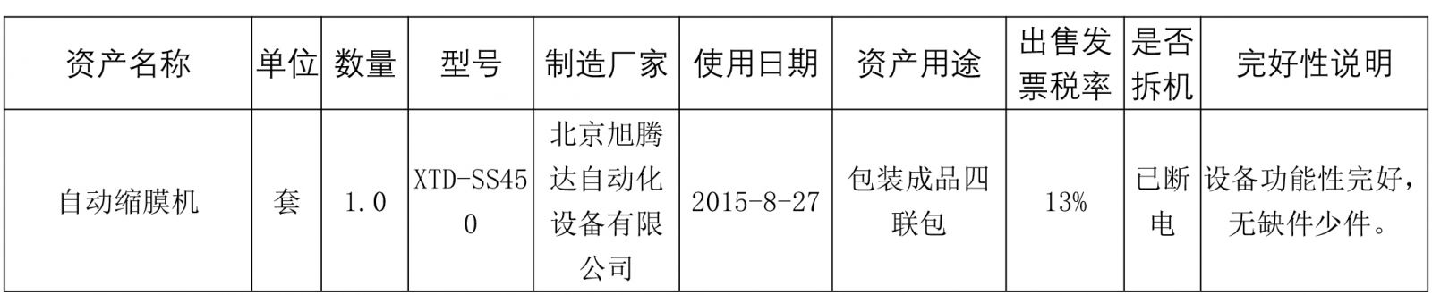 標(biāo)的二:自動(dòng)縮膜機(jī)設(shè)備一批(具體見(jiàn)附件),標(biāo)的設(shè)有保留價(jià),標(biāo)的保證金為2萬(wàn)元,起拍價(jià)5萬(wàn)元(含稅,稅率見(jiàn)詳情表) ;