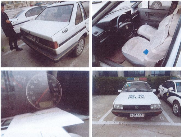 1.魯NA662警桑塔納轎車:標的車輛車身白/藍色,車架號LSVAU033092111791,排量1.8L,初次登記日期為2009年6月11日,年檢有效期至2019年6月,保險有效期至2019年3月21日,截至2018年3月28日已行駛144594公里。參考價為10350元。